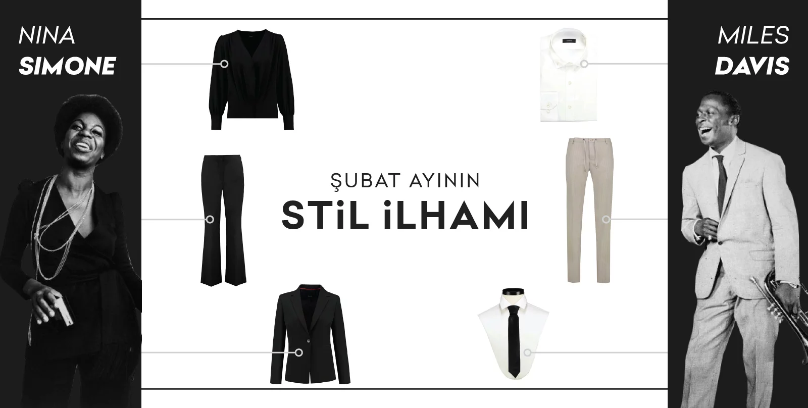 Şubat ayı stil ilhamınızı müzik sektörüne adını altın harflerle yazmış, eski okulun ve zamansız kombinlerin iki isminden aldık: Miles Davis ve Nina Simone.